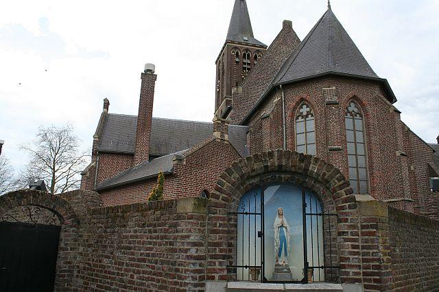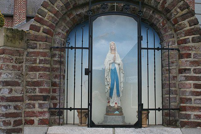 In een nis in de muur, achter plexiglas en beschermd door een smeedijzeren hekwerkje, staat een beeldje van O.L. Vrrouw van Lourdes.