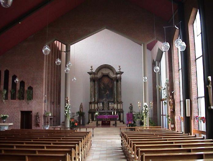 De kerk wordt betreden via een tochtportaal, dat aan twee zijden is gesloten door deuren, die zijn omzoomd door glas onder keperbogen. Het portaal geeft toegang tot onder de zangtribune, die tegen de achterwand van de kerk is geplaatst op stalen kolommen. Een trap reikt naar de tribune, die met een hekwerk is afgebiesd. De muur wordt doorbroken door drie ramen onder keperbogen. De open dakstoel van de kerk is met rode platen betimmerd en wordt ondersteund door spanten van H-balken, die via het dak langs de muren lopen. Tussen de spanten zijn ramen onder een keperboog geplaatst, zodat traveeën worden gesuggereerd. Doordat het dak aan de pastoriezijde verder doorloopt naar beneden en doordat het axiale bankenplan hier met een pad is afgescheiden van de twee andere bankenblokken, wordt een zijbeuk gesuggereerd. Dit wordt versterkt door het Maria-altaar tegen de sacristie en de biechtstoelen achterin de kerk. Boven het Maria-altaar zijn met donker glas voorziene ramen geplaatst. Het koor is afgescheiden doordat de verhoging in de insnoering begint en door een triomfboog, die is samengesteld uit drie keperbogen en twee pilaren. Centraal staat op een supedaneum een vieringaltaar, tegen de sluitmuur staat het historische hoogaltaar met predella. Het koor ontvangt licht uit vensters, die zijn gepositioneerd in de verhoging boven het koor. Hieronder zijn in de muren lisenen uitgemetseld, die in de spaarvelden zijn voorzien van wit trespa en donkere glazen. Mogelijk heeft hierachter een zangkapel gezeten. Aan de rechterzijde van het koor staat eenzelfde triomfboog als afscheiding naar de dagkapel, de voormalige kinderkapel. In de boog is met witte platen en schuifdeuren met lichtdoorlatend plastic een afscheiding gebouwd. De dagkapel wordt aan twee zijden verlicht door vensters met een keperboog. Op de vloer tot aan het koor liggen de platen hardsteen, die uit de oude kerk afkomstig zijn. De kinderbanken zijn nog in gebruik, een vaste plaats voor het vieringaltaar is er niet. Een tochtportaal achter houten deuren geeft toegang tot de buitenlucht.