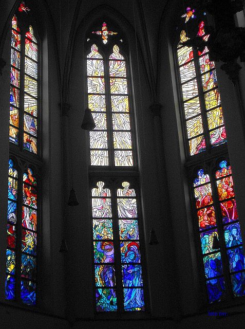 Glas-in-loodramen in het koor van Huub Kurvers. Foto: Harry Vrancken, Sweikhuisen