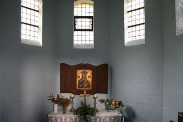 De nok van het kapeldak ligt iets onder de daklijst van het schip. Tegen de noordwand, vlakbij het koor, staat tussen twee steunberen een van een lessenaardakje voorzien zijportaal.