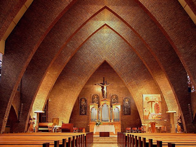 Zicht op het priesterkoor. Rechts een wandkleed van Femy Pasman-van Bruggen. Foto: Piet Bron, 2009