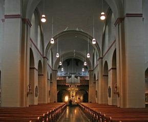 Men betreedt de kerk via de narthex in de toren. De kerk is geheel gepleisterd en geschilderd in mergelmotief met voegen. Het middenschip wordt gedekt door koepelgewelven, aangebracht bij de restauratie in 1948. De bijzonder gevormde middeleeuwse gewelven in de zijbeuken zijn omstreeks 1880 hersteld met baksteen en deels vernieuwd in 1901-'03. De in de oorlog beschadigde gewelven aan de noordzijde zijn in 1848 in mergel hersteld.