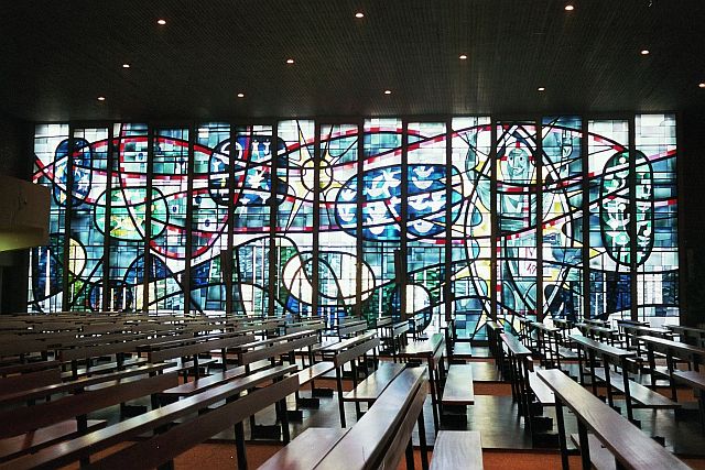 Een bijzondere plaats in de kerk neemt de grote glas-in-loodwand in, die het laatste ontwerp was van de Maastrichtse glazenier Jérôme Goffin. Deze wand bepaalt in hoge mate de sacrale sfeer van de Blijde Boodschapkerk. Hoen en Ubachs hadden expres deze wand voor glaskunst geschapen. Goffin kreeg de opdracht een tekst uit het Lucas-evangelie IV 17-19 te verwerken, waarin Christus de profeet Isaïas (61:1) aanhaalt: ‘De geest van Jahweh, mijn heer, rust op Mij, want Jahweh heeft Mij gezalfd; Hij heeft Mij gezonden om armen de blijde boodschap te brengen, om te verbinden wiens hart is gebroken, aan gevangen verlossing te melden, aan geboeiden bevrijding; om het genadejaar van Jahweh te preken, de dag der wraak van onze God’. Goffin gebruikte voor zijn raam antiek glas. De ontwerpen besprak hij met Hubert Felix uit Maastricht, in wiens atelier het raam uitgevoerd werd. Goffin zelf heeft het niet meer mogen aanschouwen. Hij stierf kort na het gereedkomen van zijn ontwerp. Zijn vrouw Tonny Goffin-Viegen vervaardigde de werktekeningen en hield toezicht op de uitvoering. Het raam is vijftien banen gevat van 120 bij 800 cm tussen de betonnen pijlers van de noordgevel. De totale oppervlakte bedraagt ca. 120 m².