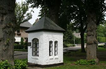De kapel ligt op een groot driehoekig gazon met oude lindebomen, in een Mookse woonwijk.
