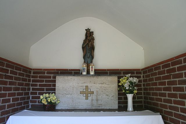 Het interieur is uitgevoerd in schoon metselwerk met rode baksteen. Het gebogen gewelf is gepleisterd en wit geschilderd. Op een rechthoekige sokkel van natuursteen op een groot altaar staat een beeld van Maria met Kind. Ten tijde van het bezoek had de kapel geen deur of afsluiting.