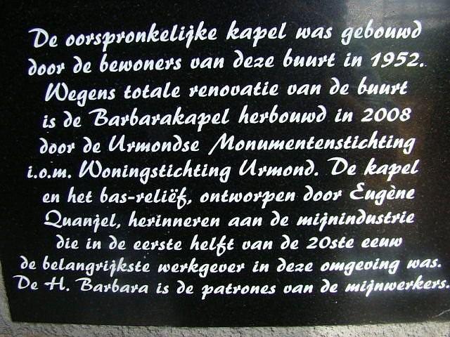 De prijzen voor de fancy-fair en de loterijen werden door Wil Heuts bij elkaar gebedeld. Hij bezocht haast alle winkels langs de Maaskant en Geleen. Binnen het comite ontstond het idee om dhr. Eug. Quanjel, hoofdopzichter bij De Staatsmijnen in Limburg en begenadigd kunstenaar, te benaderen als architect. Dhr. Quanjel was daartoe bereid. Hij ontwierp de kapel en het prachtige bas-reliëf, voorstellende de H.Barbara, staande naast een koeltoren met een schachtblok (model Staatsmijn Maurits). Aan haar voeten zijn mijnwerkers bezig met het delven van kolen. Nu het plan gereed was kon met de uitvoering worden begonnen. De door het kerkbestuur beschikbaar gestelde 6000 stenen uit de gebombardeerde pastorie moesten stuk voor stuk door de bewoners van de Kattekop ter plaatse worden schoon gekapt. Het metselwerk stond onder leiding van Pie Pepels. Harie Avesaath verzorgde het houtwerk van vensters, dak en altaartafel terwijl het ijzerwerk werd gemaakt door en o.l.v. Tjeu Hendrix. De laselektroden werden gratis geleverd door de vroegere smid Nic Gelissen. Verdere medewerkers waren o.a. Houber Hendrix, Tjeu Meuwissen en Geurtje Smeets. Voor het steigermateriaal werd een beroep gedaan op de Urmondse aannemer Sjaak van Mulken. De gemeente schonk de cement. Bij de oplevering werd bier geschonken door Wilhelm Stein uit de Beekstraat. Hij had ook tijdens de bouw regelmatig op een Jonge Klare getrakteerd. Op het verzoek van het comite aan Mgr. Lemmens, Bisschop van Roermond, om de kapel in te zegenen antwoordde deze: