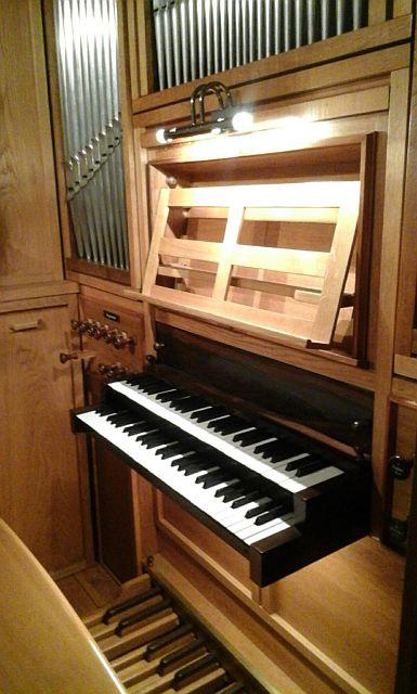 Ondertoetsen met been belegd, boventoetsen met letterhout, de grootste Prestant 8 pijpen staan achter deels buiten de kas, windmoter buiten de kas.