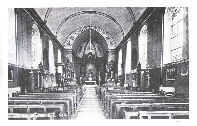 Foto van het interieur van de kerk uit 1959; één jaar voordat de kerk gesloten werd.  Na sluiting is het gehele kerkmeubilair inclusief altaar en preekstoel en orgel verwijderd. Huidige aanwending is sociëteit- en expositieruimte. Collectie Harry Vrancken, Sweikhuizen